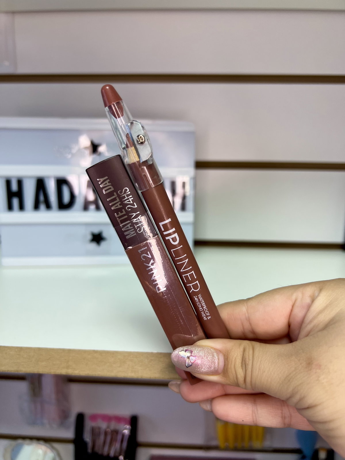 Incluye labial líquido mate y delineador mate de larga duración (24 hs). Textura suave, cobertura total y acabado profesional.